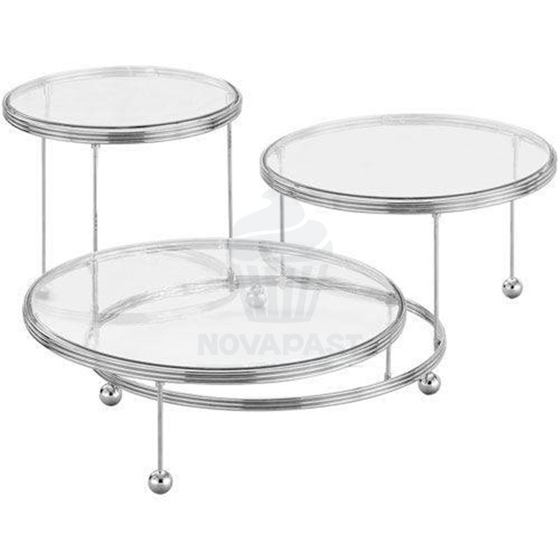 Cakes 'N More 3 Tier Party Stand. Elegant 3-piece decorative stand for wedding cakes, but also for other creative cakes. Made of metal with a chrome finish. The plates are clear plastic with a crystal appearance. Sizes: 20, 25, and 30cm.