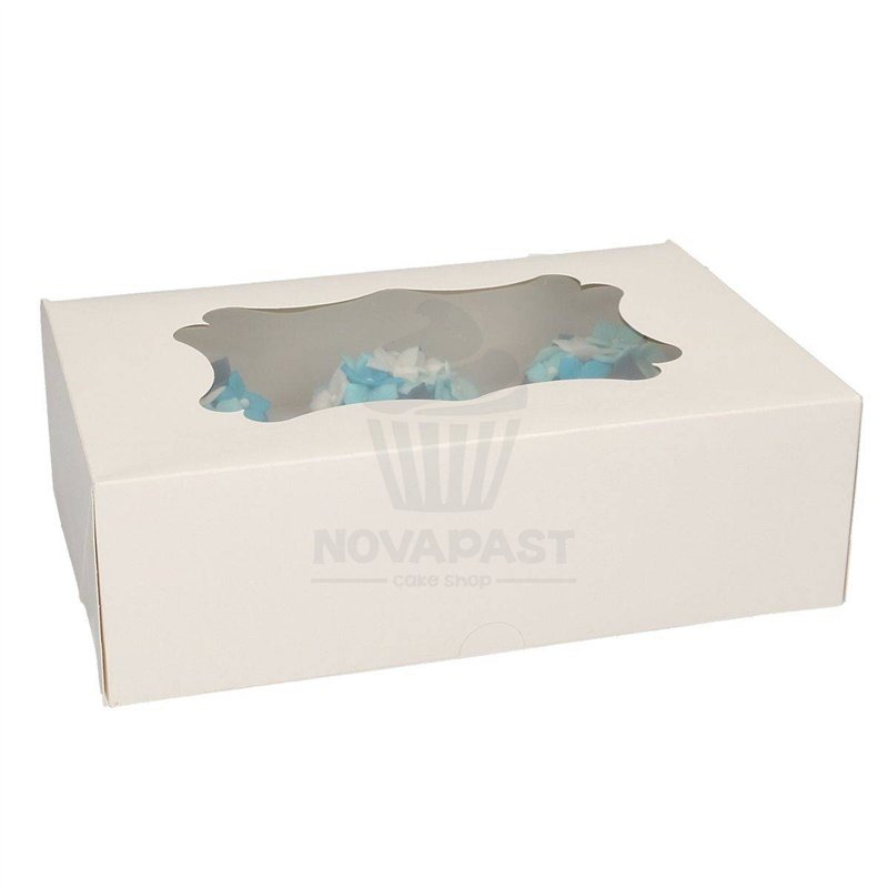 This white cupcake box from FunCakes can be used to present 6 cupcakes. The box is very sturdy and has a convenient window.