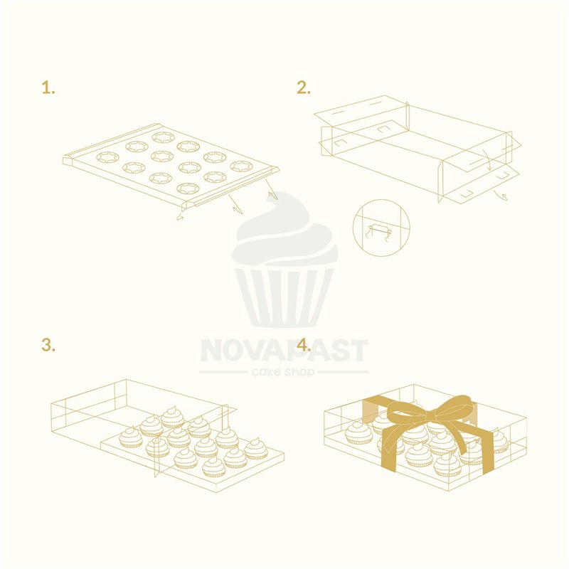 White box for 4 cupcakes. Dimensions: width 19.8 x length 19.8 x height 8 cm. The sales unit is 1 box + 1 stand included.