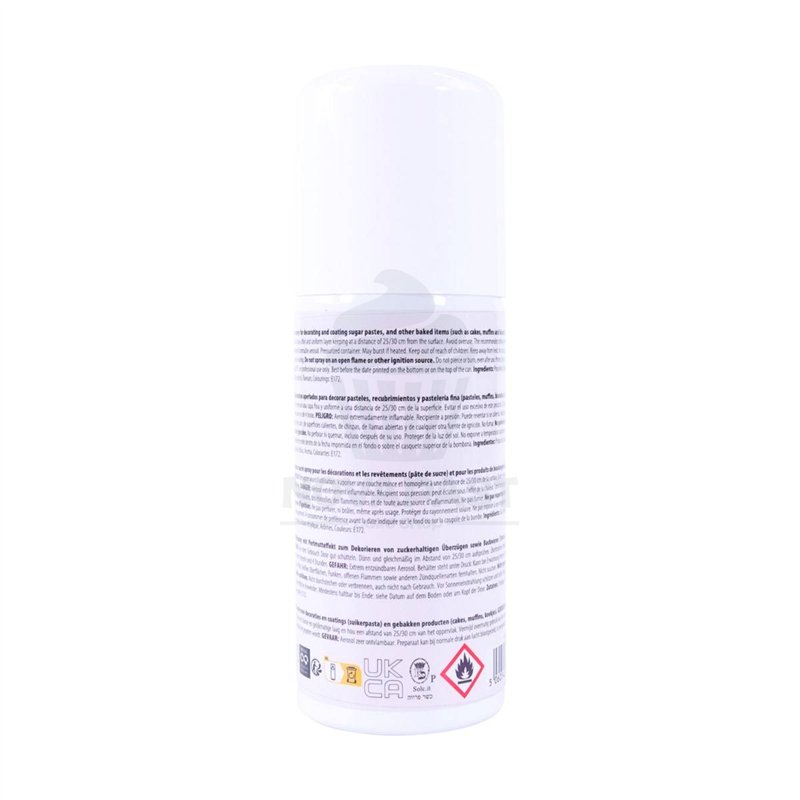 Instructions for use: Suitable for decorating chocolate, creams, fondant, gum paste, modeling paste, and marzipan. Shake well before use. Spray an even layer on the surface from a distance of 20 cm. The recommended setting time before consumption is 4 hours. After use, turn the spray can upside down and spray for a few seconds to clean.