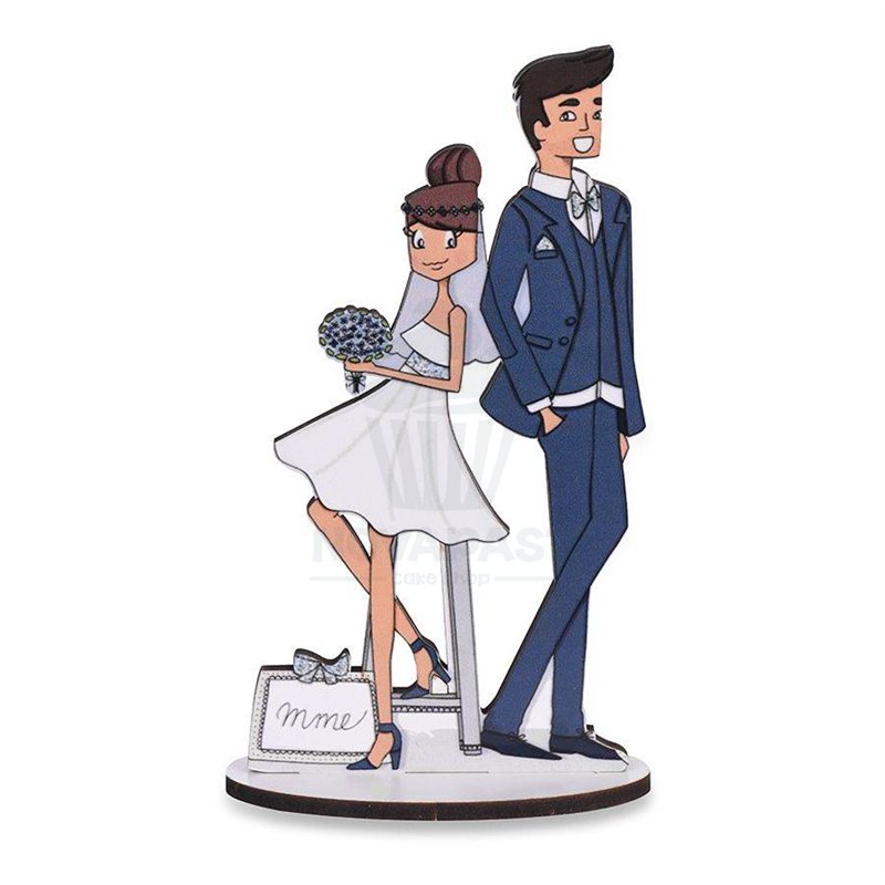 Couple of newlyweds suitable for placing on cakes and events. Made of wood, with intense and modern colors.