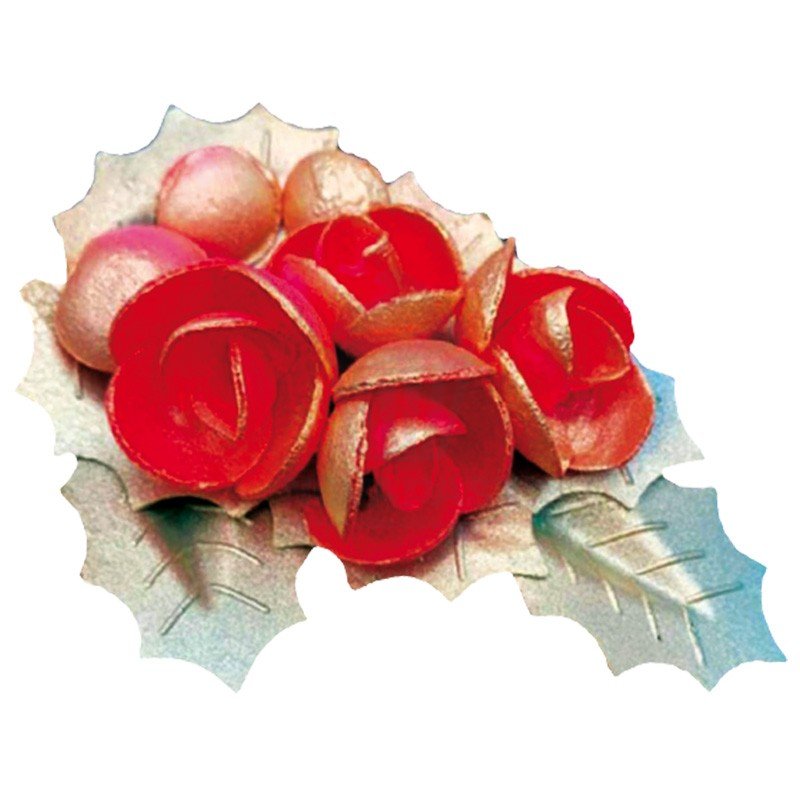Unicolor wafer flowers with integrated leaves. Resistant to freezing and ideal for placing directly on cakes and desserts.
