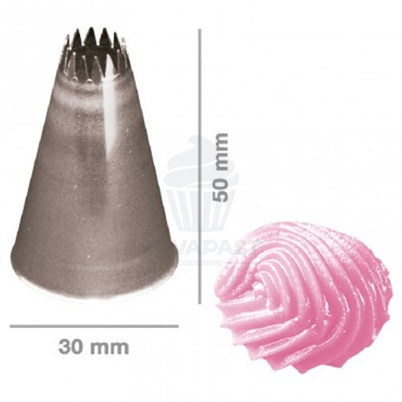 Discover the special wide nozzle of 5 cm from the renowned brand FG, an essential accessory for pastry enthusiasts looking to take their creations to the next level. Made of high-quality stainless steel, this nozzle ensures durability and resistance, allowing you to work with precision and confidence every time. Its wide design is ideal for decorating cakes, cupcakes, and other desserts with a professional finish, making it easy to create unique patterns and textures. Additionally, its easy cleaning and compatibility with most piping bags make it a versatile and practical tool for any kitchen. With the FG special wide nozzle, every detail counts to transform your sweets into true works of art.A professional line of star-shaped nozzles in stainless steel without welding points, to be used without an adapter. Pack of 10 pieces.
