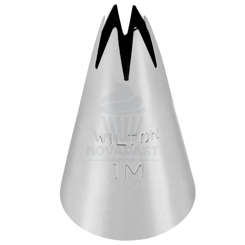Metal tip #1M (decorating tip) from Wilton for creating star techniques, drop flowers, and scalloped edges. It is supplied packaged individually, in a blister pack (with identification card).