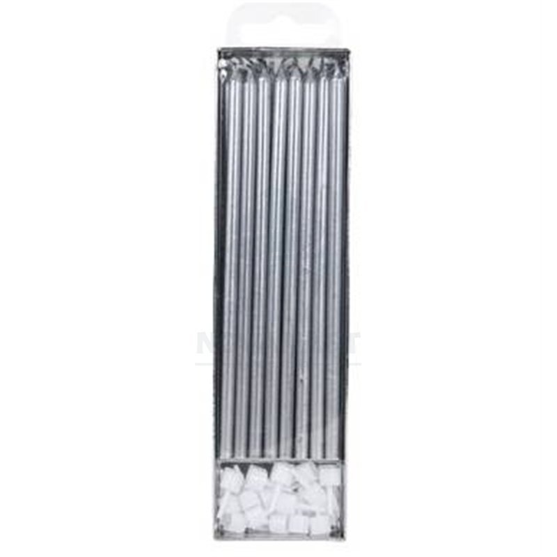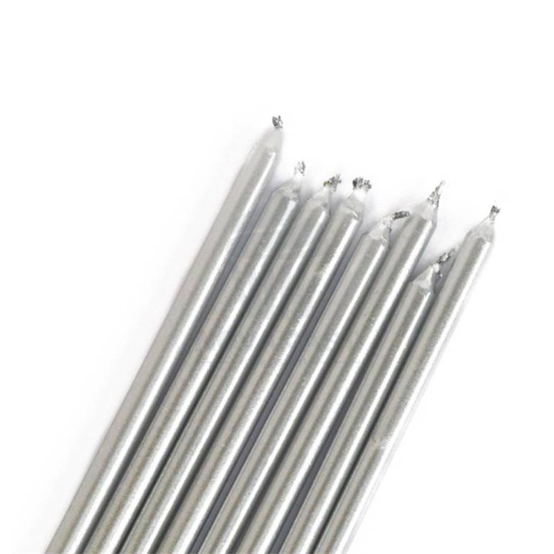 Elegant tall candles, 18 cm long, ideal for decorating cakes and sweets. The set includes a set of candle holders to stick onto the product.