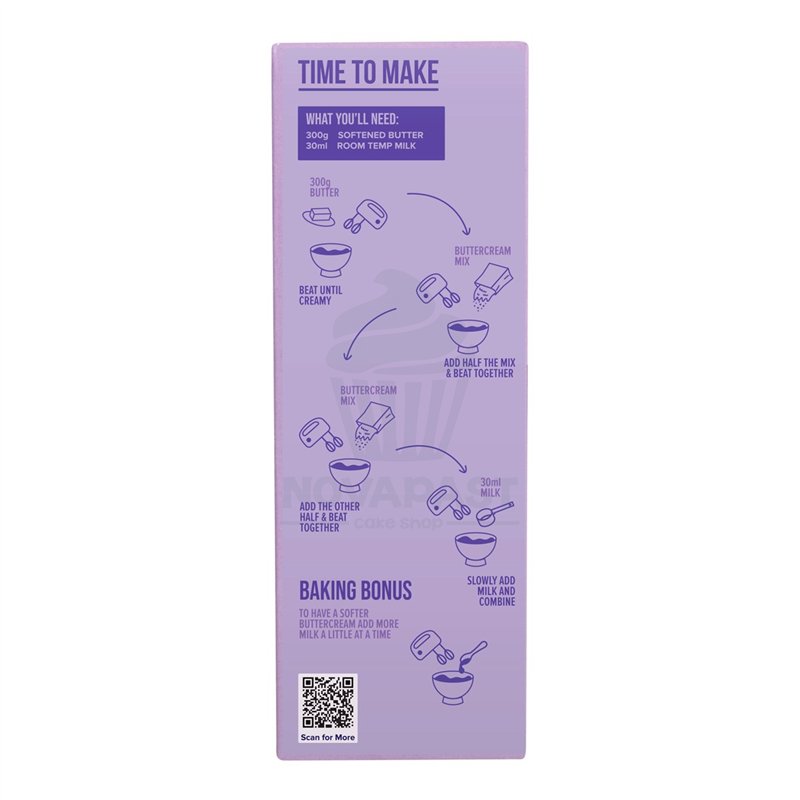 This FunCakes buttercream is perfect for filling, covering, and decorating cupcakes, cakes, and much more. You only need to add water and butter to this mix to get the most delicious Buttercream in the world. Preparation: Ingredients should be at room temperature. For one portion: add 125 ml of water to 125 g of mix and beat with a mixer. Then, let the mixture sit at room temperature for at least an hour. Beat 150 g of unsalted butter (cream) for about 5 minutes until creamy. Add a portion of the mixture to the butter and beat until the mixture is completely absorbed before adding the next portion. Once everything is added, beat until you obtain a smooth buttercream (approx. 10 minutes). One portion of buttercream is enough to fill and cover a 20 cm cake, or decorate approximately 12 cupcakes.