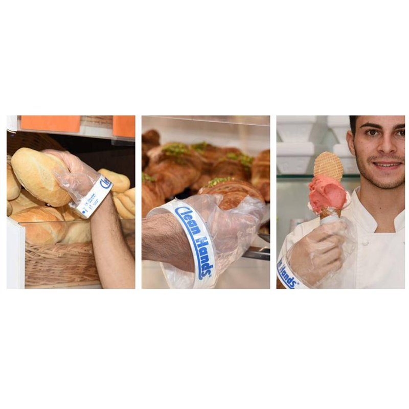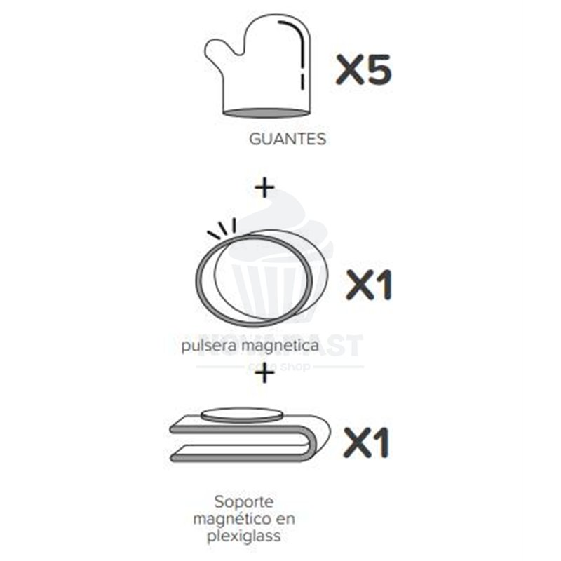 Multi-use kit ideal for bakeries, pastry shops, food stores, and supermarkets. The kit consists of a plexiglass magnetic holder, a magnetic bracelet, and 5 gloves. We offer glove replacements in packages of 100 units. Link here.