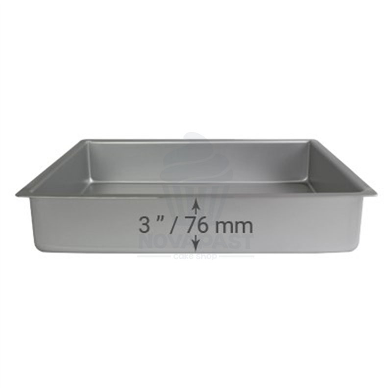 Deep oblong (rectangular) PME tray measuring 22.5 x 32.5 x 7.5cm. A seamless anodized aluminum cake tray that provides good heat conduction, with perpendicular sides and a slightly rounded angle to facilitate covering with fondant or marzipan.