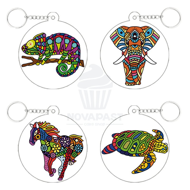 Discover the magic of carrying a touch of art and nature with our colorful animal keychains. This set includes four unique designs: a chameleon, an elephant, a horse, and a turtle, each adorned with vibrant geometric and floral patterns that capture the essence of creativity and the diversity of the animal kingdom.