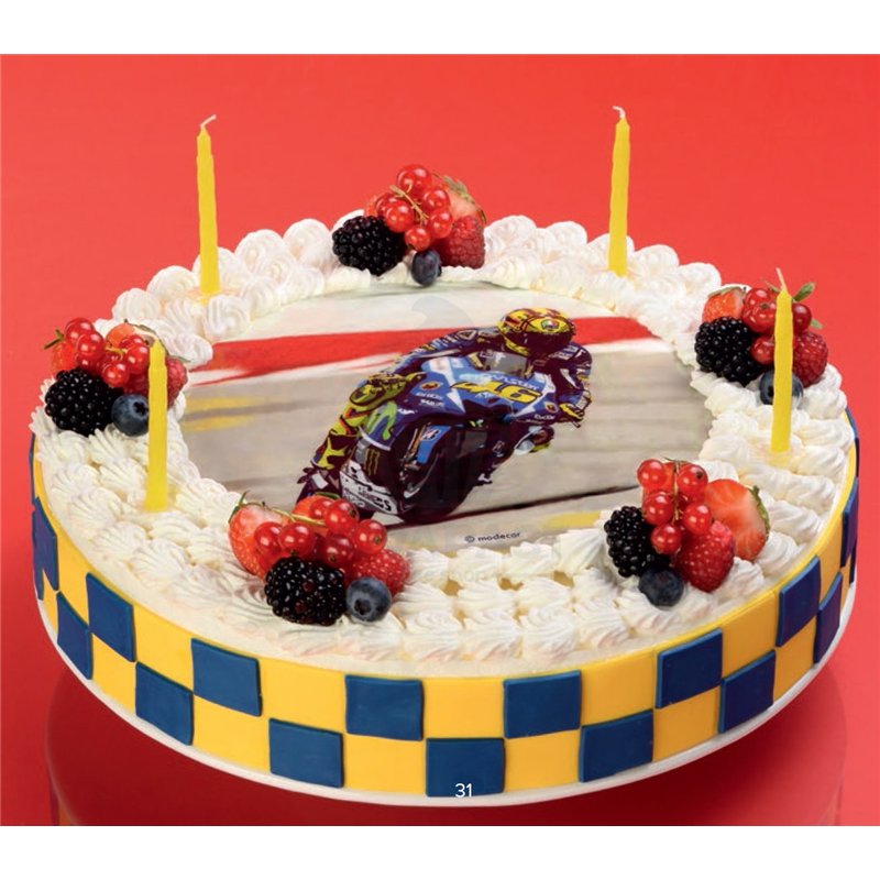 In summary, the Edible Round Moto GP Wafer (UNIT) is a fantastic option for those who want to add a special and personalized touch to their pastry creations. With its ease of use and striking design, it is the perfect choice for any special occasion. Make your desserts unforgettable with this incredible edible wafer!