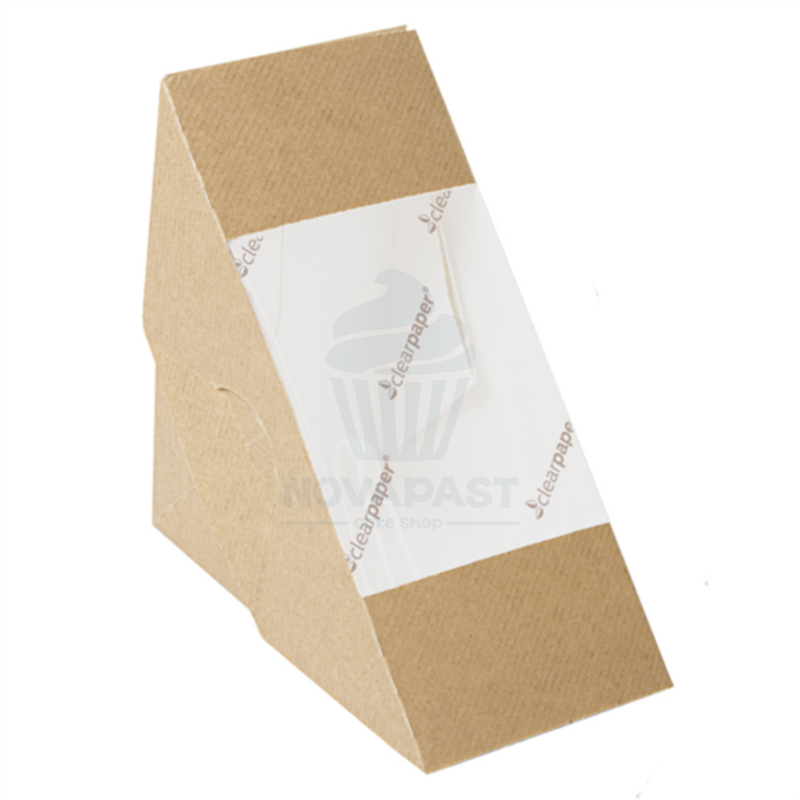 Container made of kraft cardboard suitable for food contact. Equipped with a window for product viewing. You can present sandwiches, sweets, pastries...