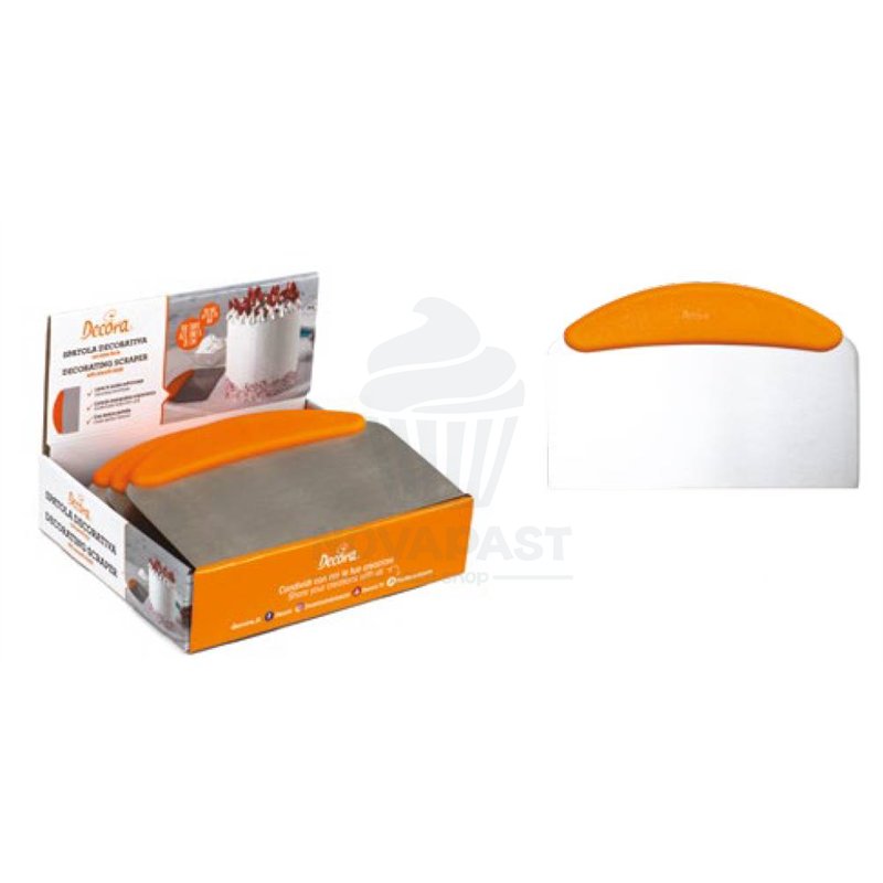 Excellent Decora scraper for smoothing, cutting, and processing all kinds of chocolates, creams, and fillings. It features a comfortable ergonomic handle and is made of stainless steel.