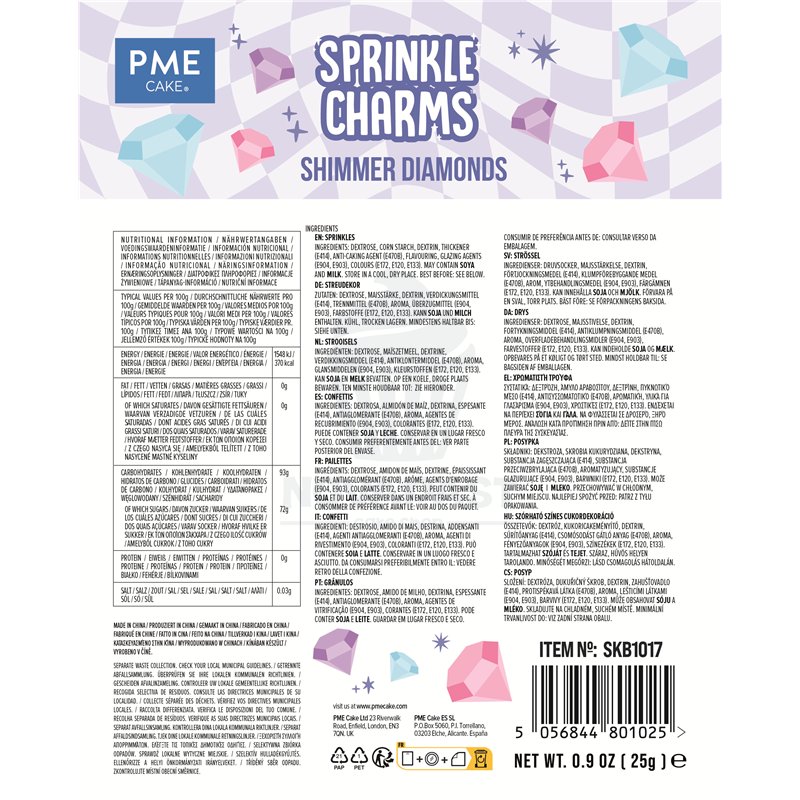 Elevate your baking game with PME Blister Sprinkles Diamantes Brillantes 25gr and impress your friends and family with desserts that look as good as they taste. Perfect for special occasions or just to add a little sparkle to your everyday treats, these sprinkles are a must-have in any baker's pantry.