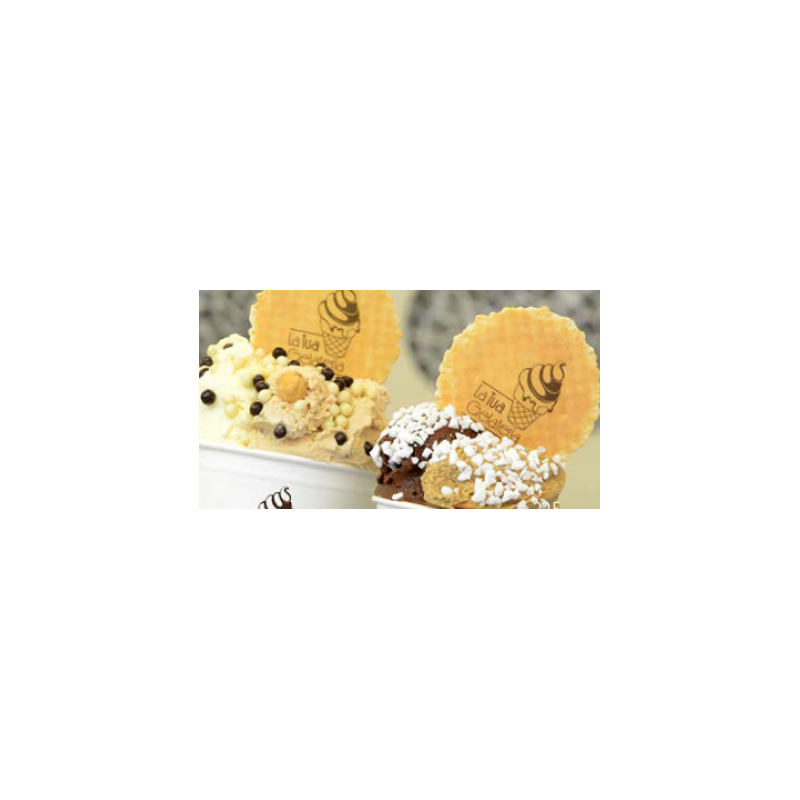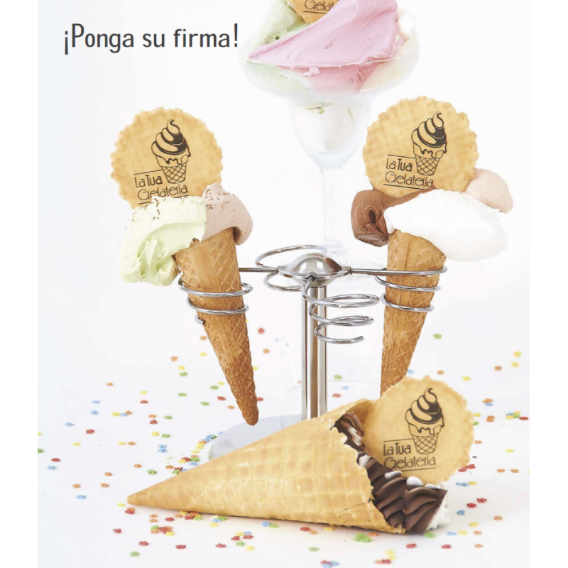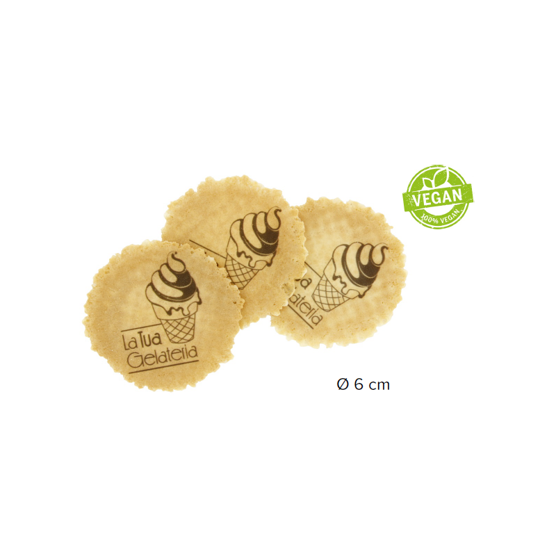 Barquillos crujientes diseñados para decoración y servicio de helados, con impresión personalizada en color marrón sobre la superficie. Producto 100% vegano, elaborado con ingredientes aptos para uso alimentario en heladerías, pastelerías y restauración.