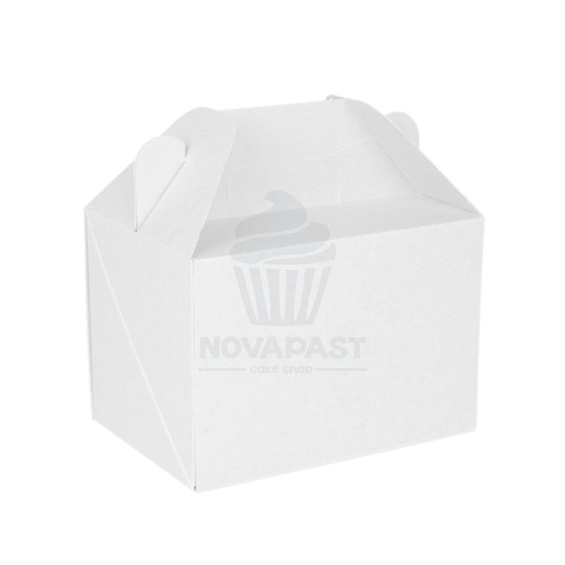 Producto personalizable con tu propia pegatina.Caja para pastas con asas en color blanco automontable en una pieza.