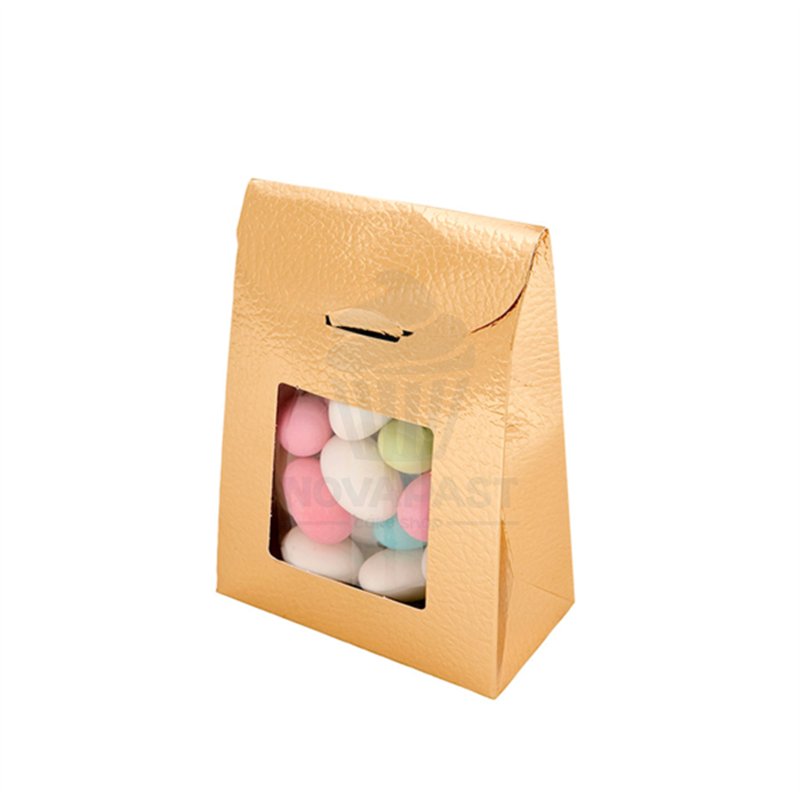 Original saquito para bombones y otras delicias gastronómicas. Están diseñados en color oro con una ventana transparente para poder apreciar lo que hay en su interior. Este producto les garantiza una elegante presentación para sus productos más exquisitos.