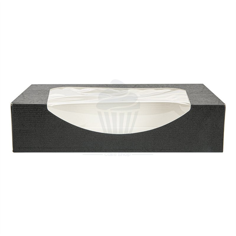 Presentamos la "Caja Snack con Ventana Negra 19,7x12x4,5 cm", la solución perfecta para presentar y transportar tus deliciosas creaciones de repostería y pastelería. Esta caja de diseño elegante y sofisticado, no solo protege tus productos, sino que también los realza, convirtiéndolos en el centro de atención.