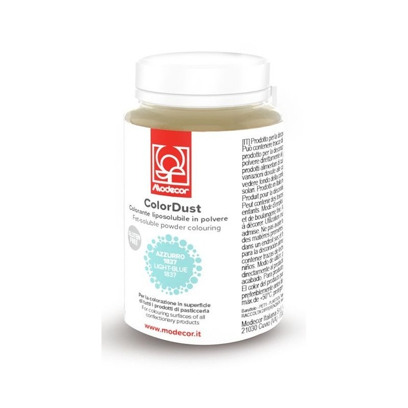 Color en polvo en tono perlado para superficies. Ideal para decoraciones de chocolate, productos a base de azúcar, pasta de almendra y productos para hornear. Para decorar chocolate y obtener colores brillantes, mezclar 1 gr. de polvo con 2 gr. de alcohol y aplicar con pincel.