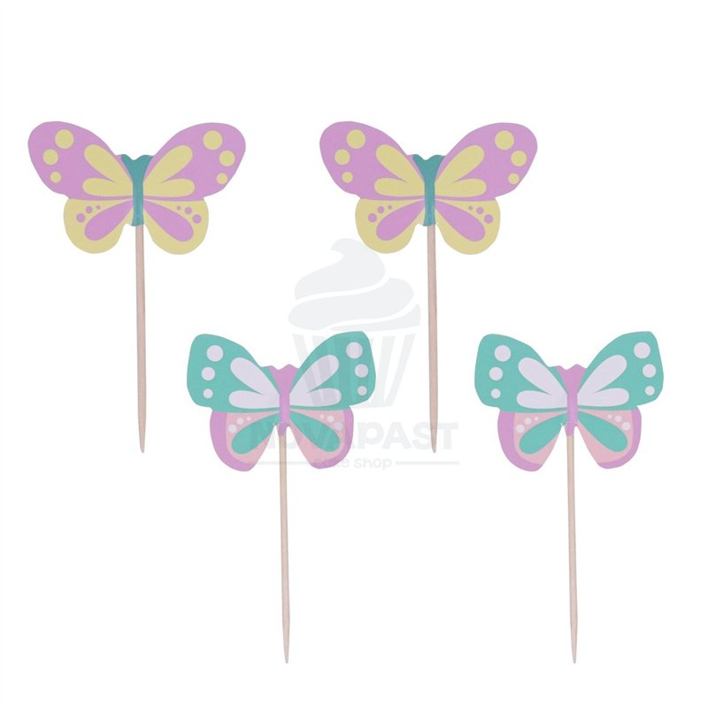 Paquete de 24 toppers de papel de doble cara con diseño de Mariposa. El papel mide aprox 31 x 51mm, y el palito de madera mide 45mm.