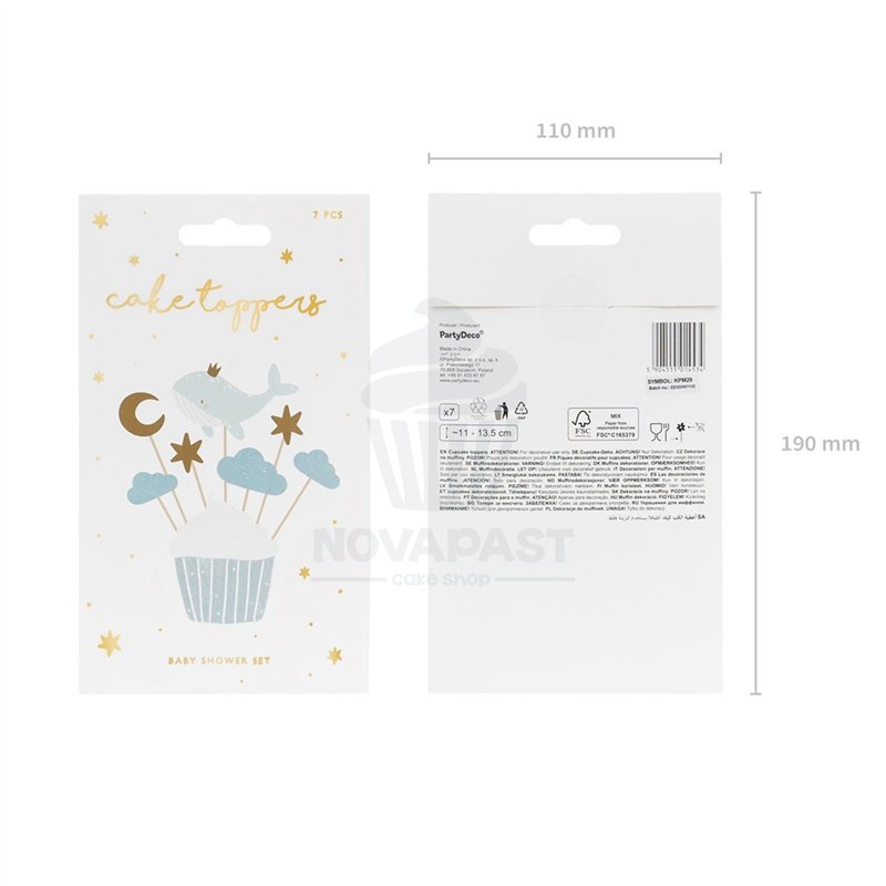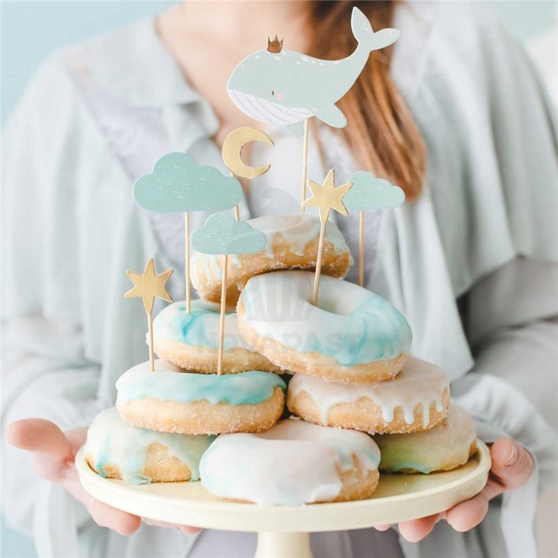 El set incluye siete toppers únicos, cada uno diseñado con un motivo de ballena y cielo, que aportan un aire fresco y divertido a tus cupcakes. Con estos toppers, no solo decoras, sino que también cuentas una historia en cada bocado.
