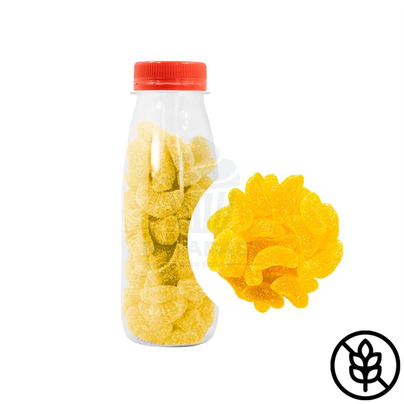 Deliciosos gajos de gominola bañados en azúcar con un intenso sabor. Ideal para decoraciones de postres y tartas. Resistente a la congelación. Presentado en práctico bote para su conservación. Tamaño unitario: 2 cms. aprox. Peso: 175 gramos.