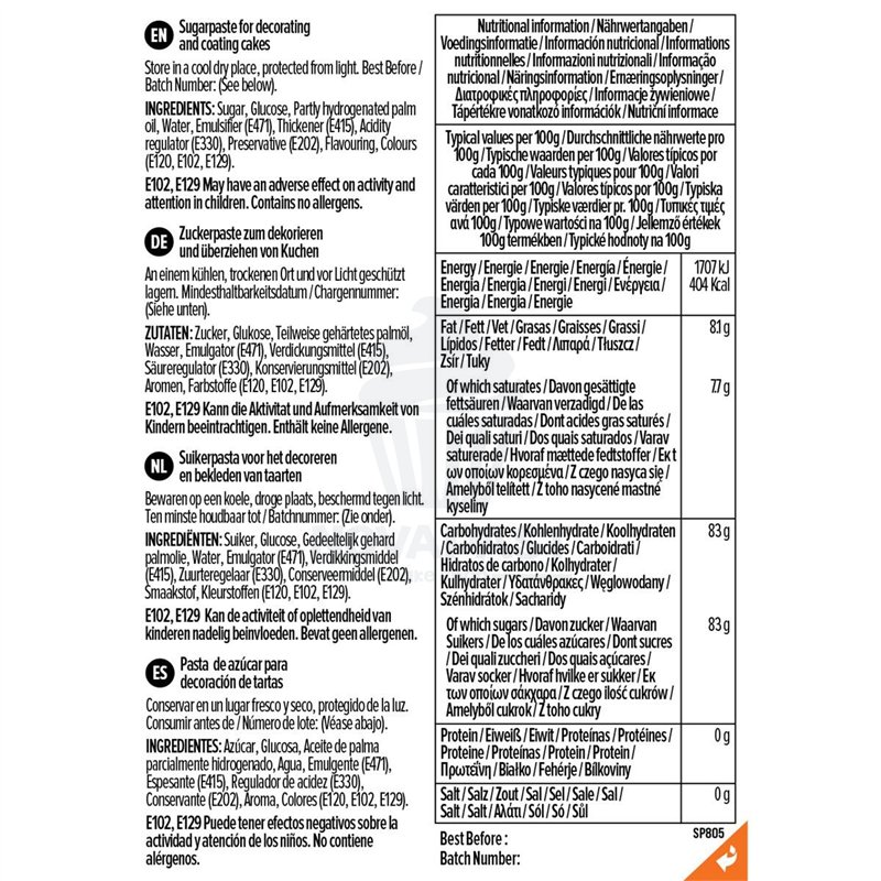 La pasta de azúcar Azul Denim tiene un delicioso sabor a vainilla. Es perfecta para cubrir una tarta y recortar formas. Amase bien antes de usarla y extiéndala sobre una fina capa de azúcar glas. También puede utilizar la pasta de azúcar para modelar o crear diferentes formas y diseños. Se puede colorear con colorantes para alimentos. Deje reposar el fondant durante una hora después de colorearlo (cubierto) para obtener los mejores resultados. Volver a amasar la pasta de azúcar antes de seguir trabajando. Para cubrir una tarta redonda de 20 cm de diámetro, necesitará aproximadamente 500 g de fondant.