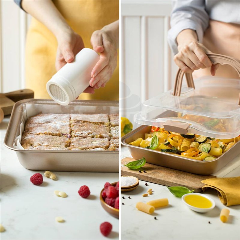 Set de 2 piezas compuesto por 1 molde de metal antiadherente de alta calidad y 1 práctica tapa para guardar y transportar tus platos. Fácil de usar y fácil de decorar. Es perfecto para hacer preparaciones dulces y saladas.