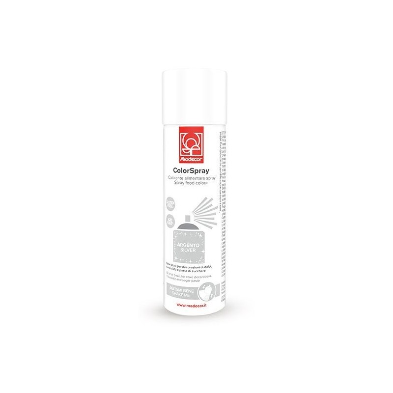 Instrucciones de uso: Adecuado para la decoración de chocolate, cremas, fondant, pasta de goma, pasta de modelar y mazapán. Agitar bien antes de usar. Pulverizar una capa homogénea sobre la superficie desde una distancia de 20 cm. El tiempo de fraguado recomendado antes de su consumo es de 4 horas. Después de su uso, dar la vuelta al bote de spray y pulverizar durante unos segundos para limpiar.