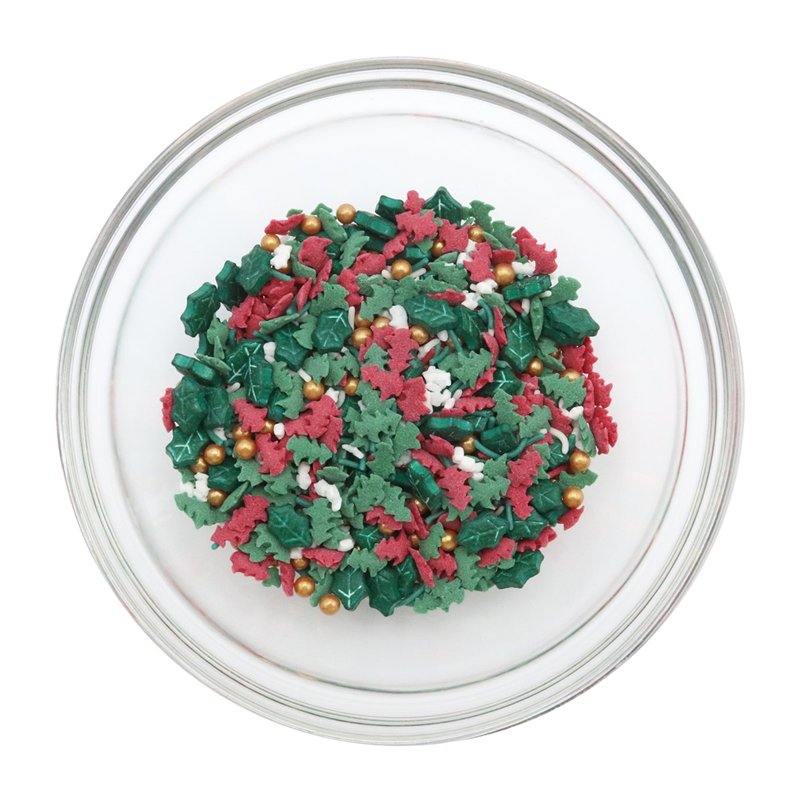 Estos sprinkles están diseñados para capturar la esencia de la Navidad con sus colores vibrantes y formas festivas. Incluyen pequeñas figuras de árboles de Navidad en verde y rojo, hojas de acebo, estrellas blancas y perlas doradas que aportan un brillo especial a tus dulces. Además, las pequeñas líneas de colores añaden un toque de diversión y variedad a tus decoraciones.