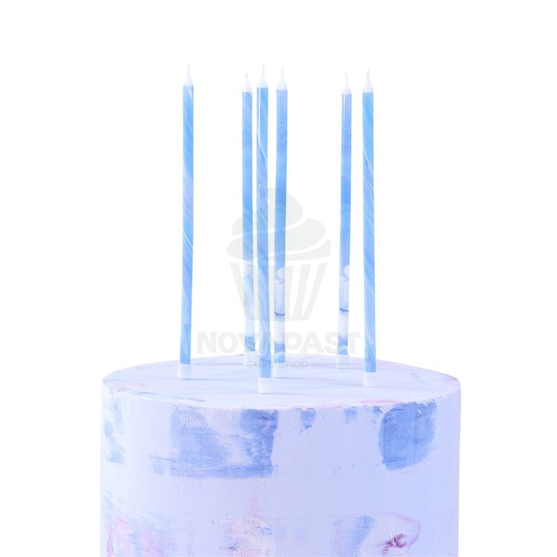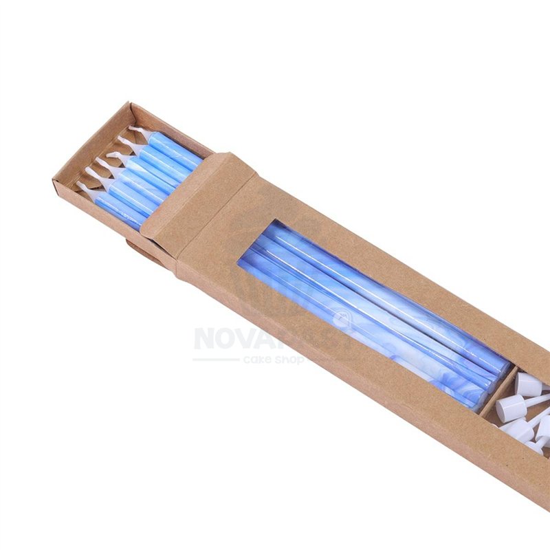El diseño en tonos celestes y blancos es versátil y se adapta a una amplia gama de temas de fiesta, desde cumpleaños infantiles hasta bodas y aniversarios. La combinación de colores suaves y neutros permite que estas velas se integren perfectamente en cualquier decoración, aportando un toque de luz y color sin ser abrumadoras.