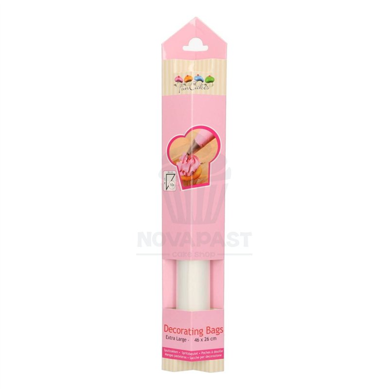 Les poches à douille jetables de FunCakes sont des poches de haute qualité, parfaites pour des garnitures froides, chaudes, épaisses et légères. Ces poches à douille sont fabriquées avec un matériau très flexible et antidérapant, idéales pour la décoration de gâteaux, cupcakes, biscuits et bien plus encore. Les poches peuvent être remplies avant utilisation, conservées au réfrigérateur et chauffées au micro-ondes ou au bain-marie lorsqu’elles vont être utilisées. Taille de la poche à douille : env. 46 x 26 cm.