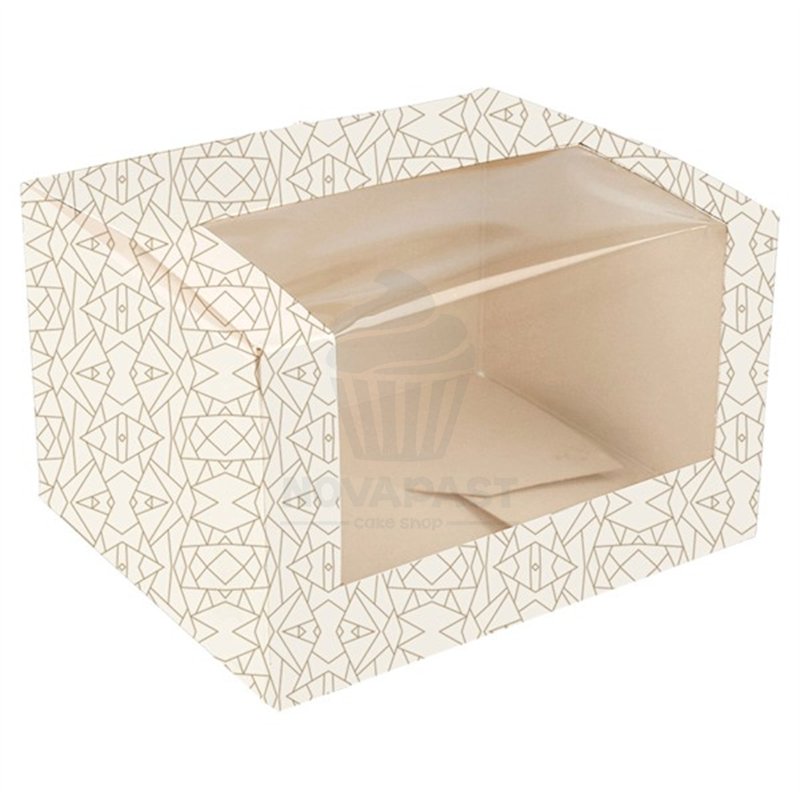 Caixa para massas com janela em cor branca e desenhos dourados, automontável em uma peça.